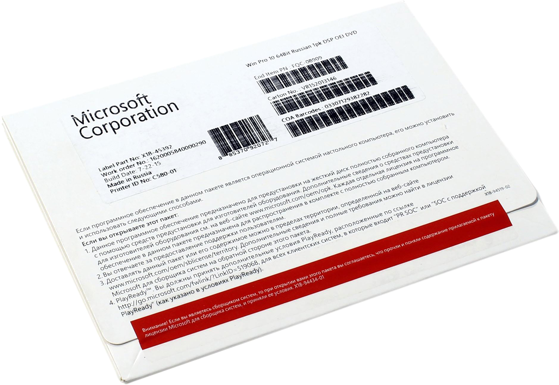 Внимание! Если вы являетесь сборщиком систем, то при покупке вами этого пакета вы соглашаетесь, что прочли и поняли содержание прилагаемой к пакету лицензии Microsoft для сборщика систем, и приняли её условия.